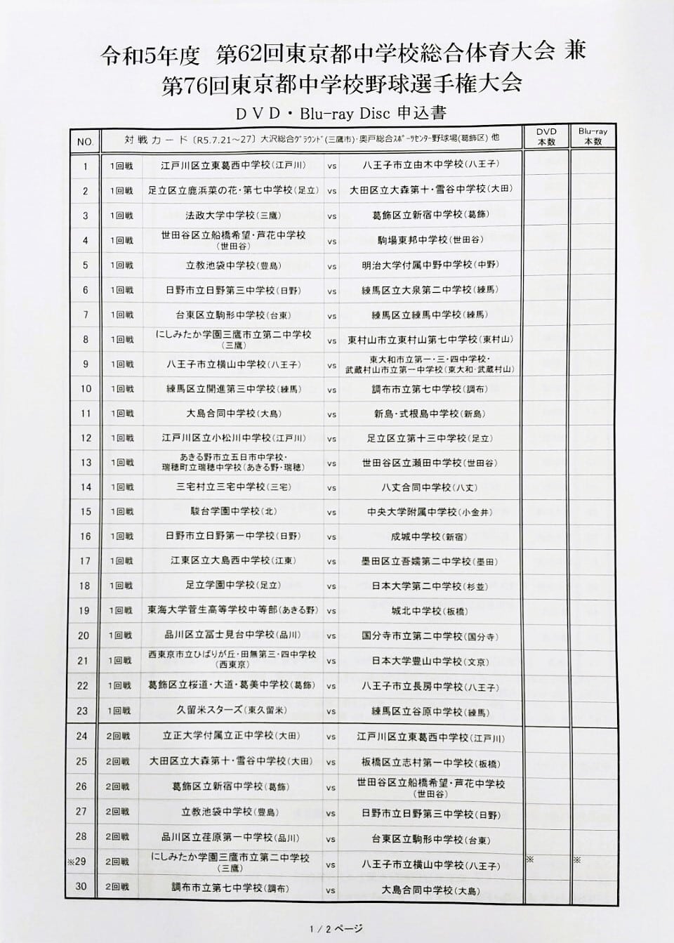 令和5年度第62回東京都中学校総合体育大会兼第76回東京都中学校野球選手権大会DVD